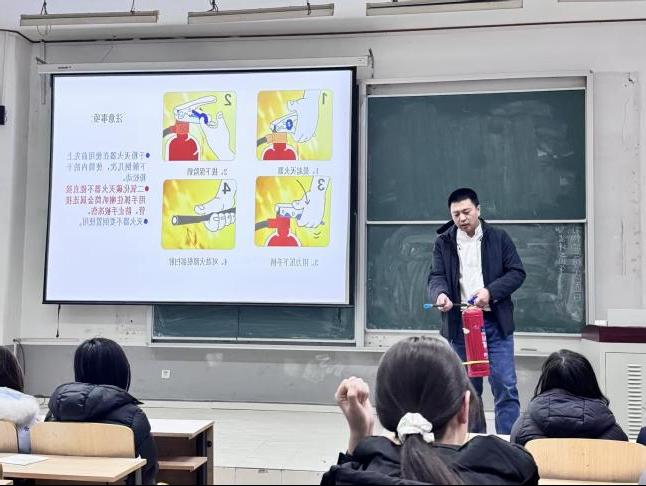 讲座中,时代书记结合典型的校园火灾案例,深入剖析火灾成因、危害及防范要点,详细解读消防安全“四个能力”内涵,引导师生明确安全责任、掌握隐患排查方法。在实操环节,他现场演示灭火器“提、拔、握、压”的规范操作流程,讲解火灾逃生要点,提醒大家牢记低姿捂鼻、有序疏散、不乘电梯等自救常识,确保关键时候能避险、会逃生。